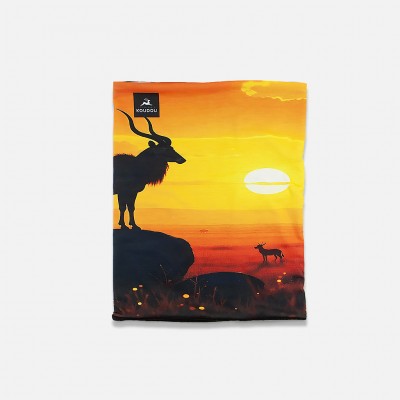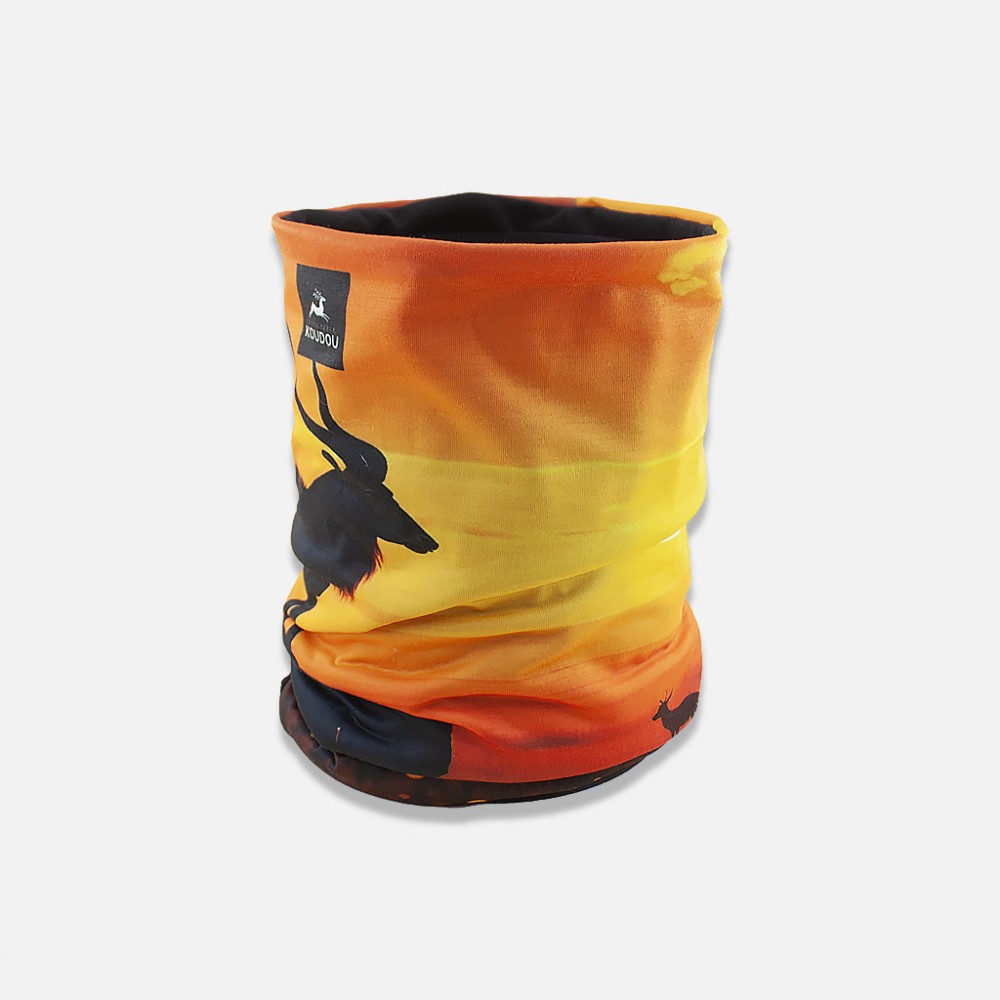 Tour de cou technique en polyester thermo régulant motif koudou sur fond ensoleillé et polaire noire. Sa doublure polaire vous apportera un confort thermique et une régulation thermique pour les activités les plus extrêmes